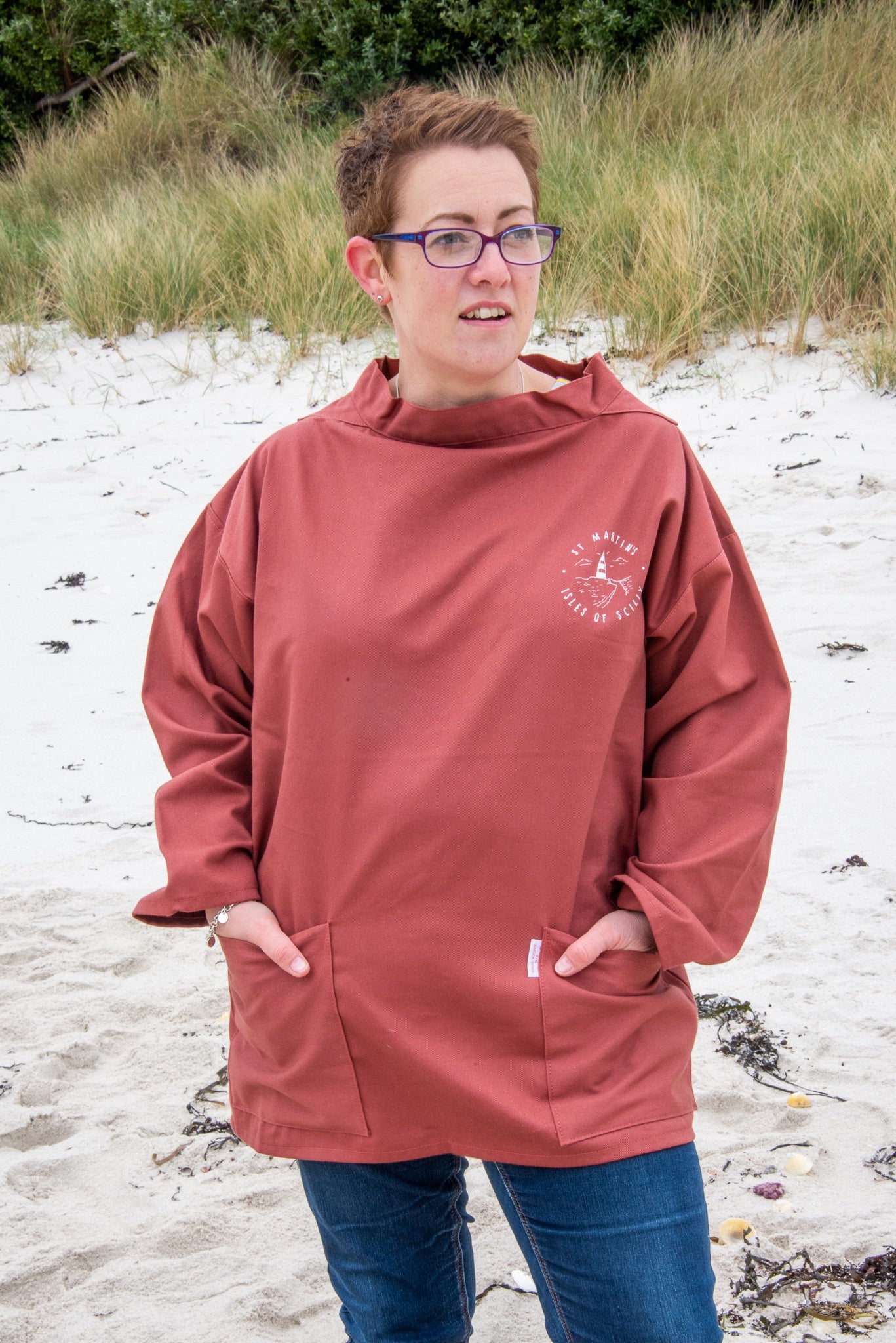 The crew neck is the traditional style of Cornish fisherman’s smock, originally worn by them to keep their woolen jumpers clean underneath. It now has full length sleeves and two front pockets to adapt to the many uses it now covers.
