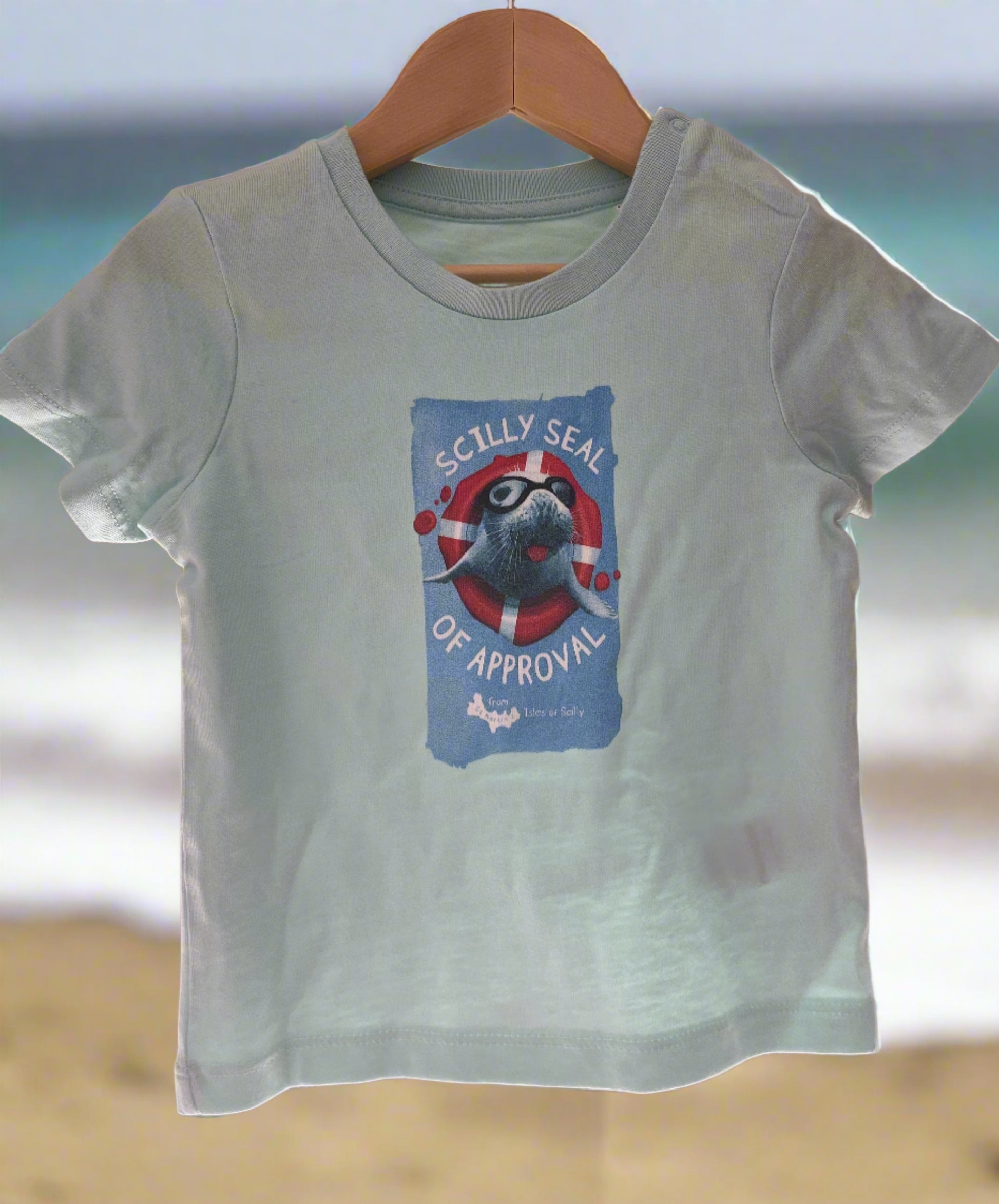In the beautiful chrystal clear light lagoon colour of Scilly's sea in summer, this organic cotton tee features our cheeky Scilly Seal. It is available to fit little ones aged 0-6 months through to 24-36 months. So no matter how small you are, you can still Get Your Scilly On!