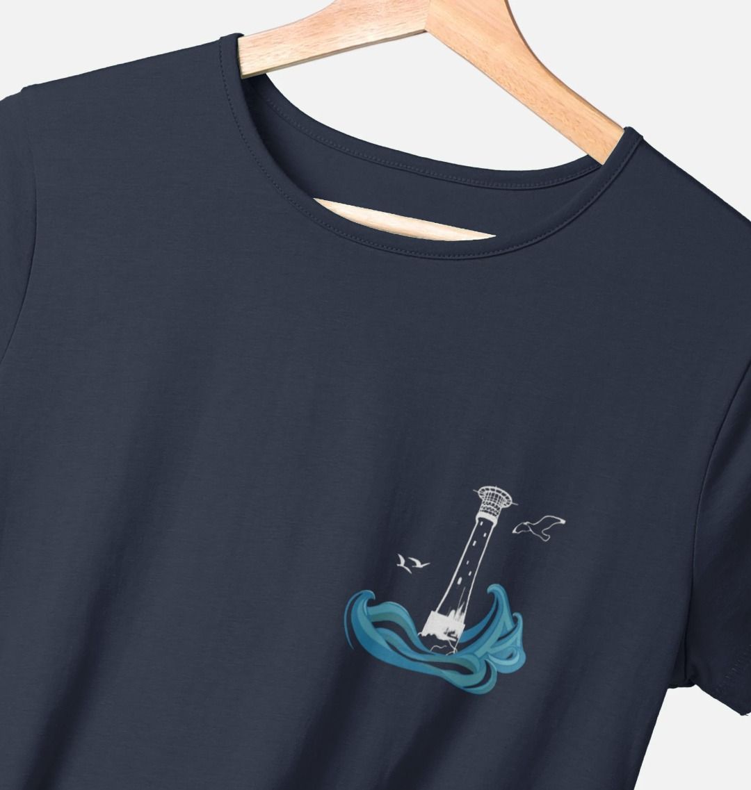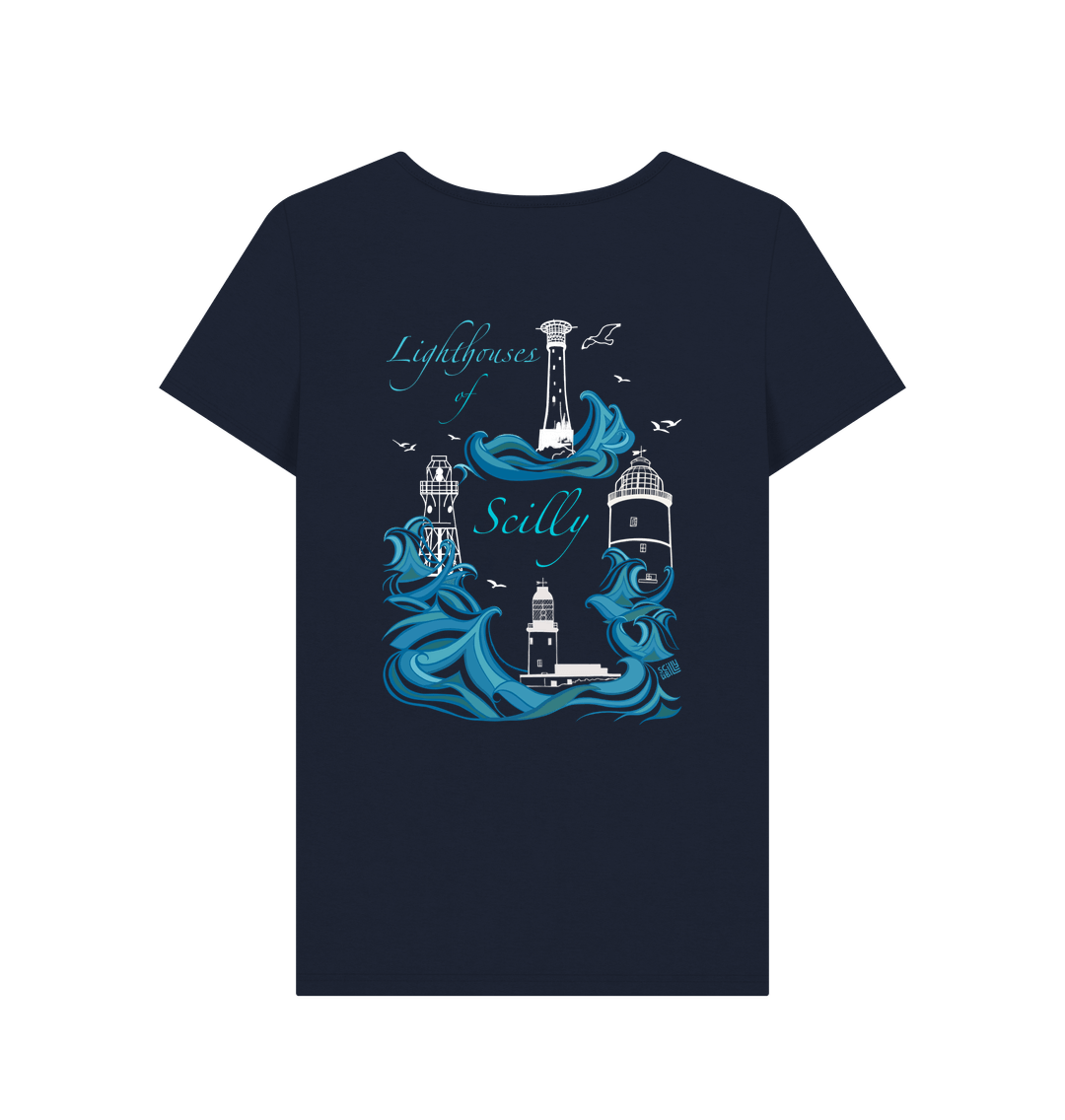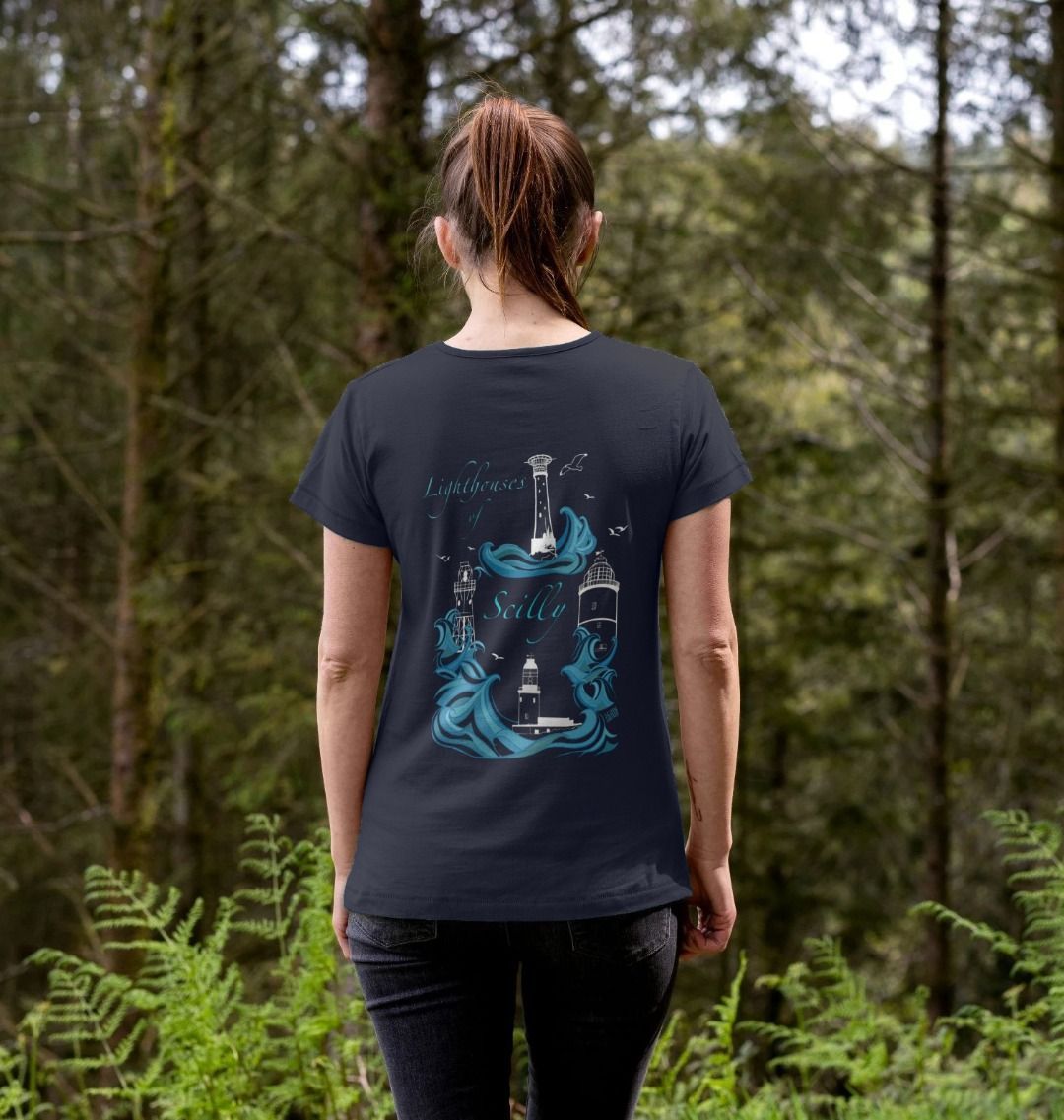 Featuring the Bishop Rock lighthouse as a breast print, and the full collection of the Lighthouses of Scilly on the back, surrounded by swirling sea. Perfect for lovers of Scilly, the sea and maritime history.