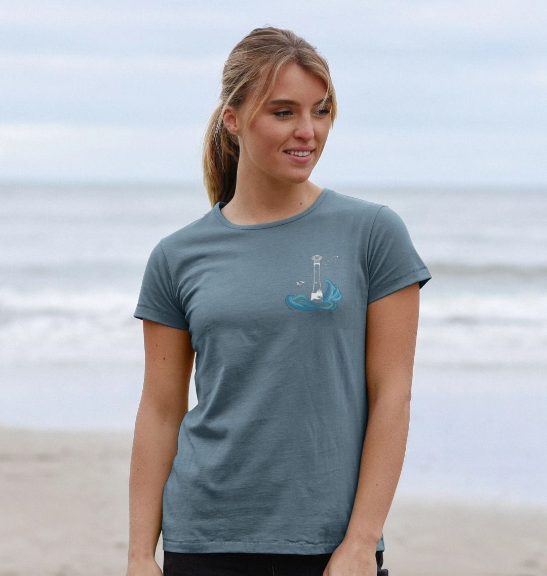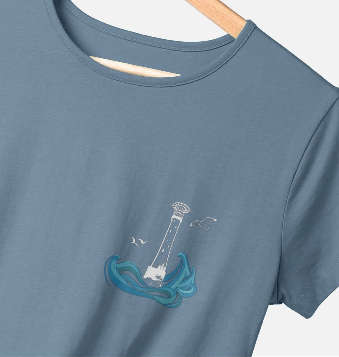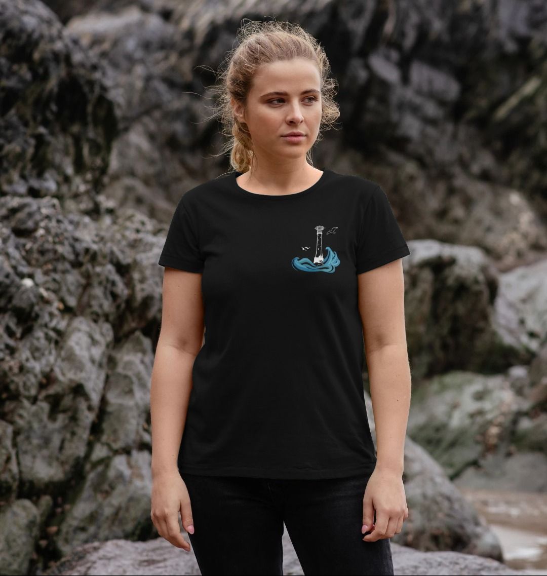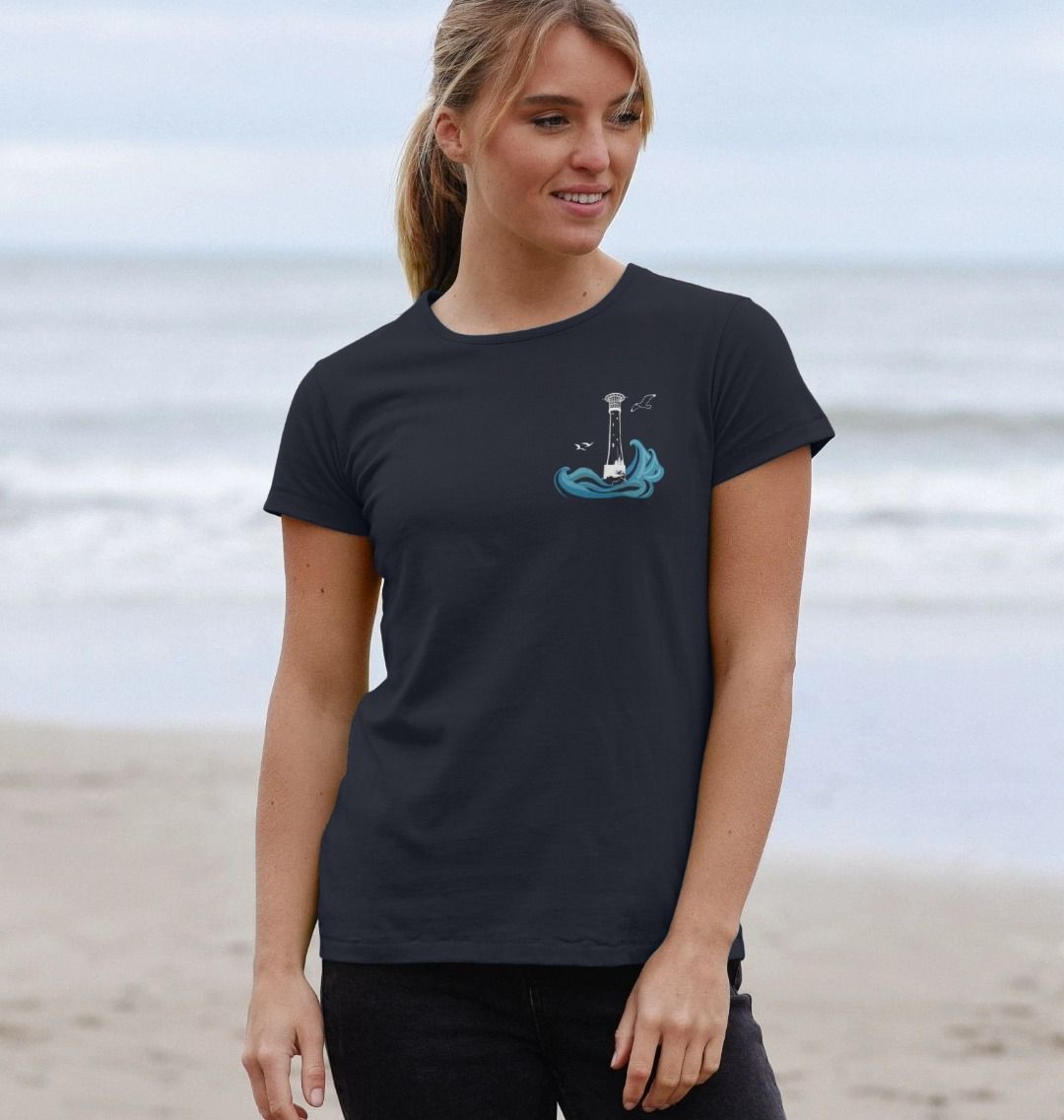 Featuring the Bishop Rock lighthouse as a breast print, and the full collection of the Lighthouses of Scilly on the back, surrounded by swirling sea. Perfect for lovers of Scilly, the sea and maritime history.