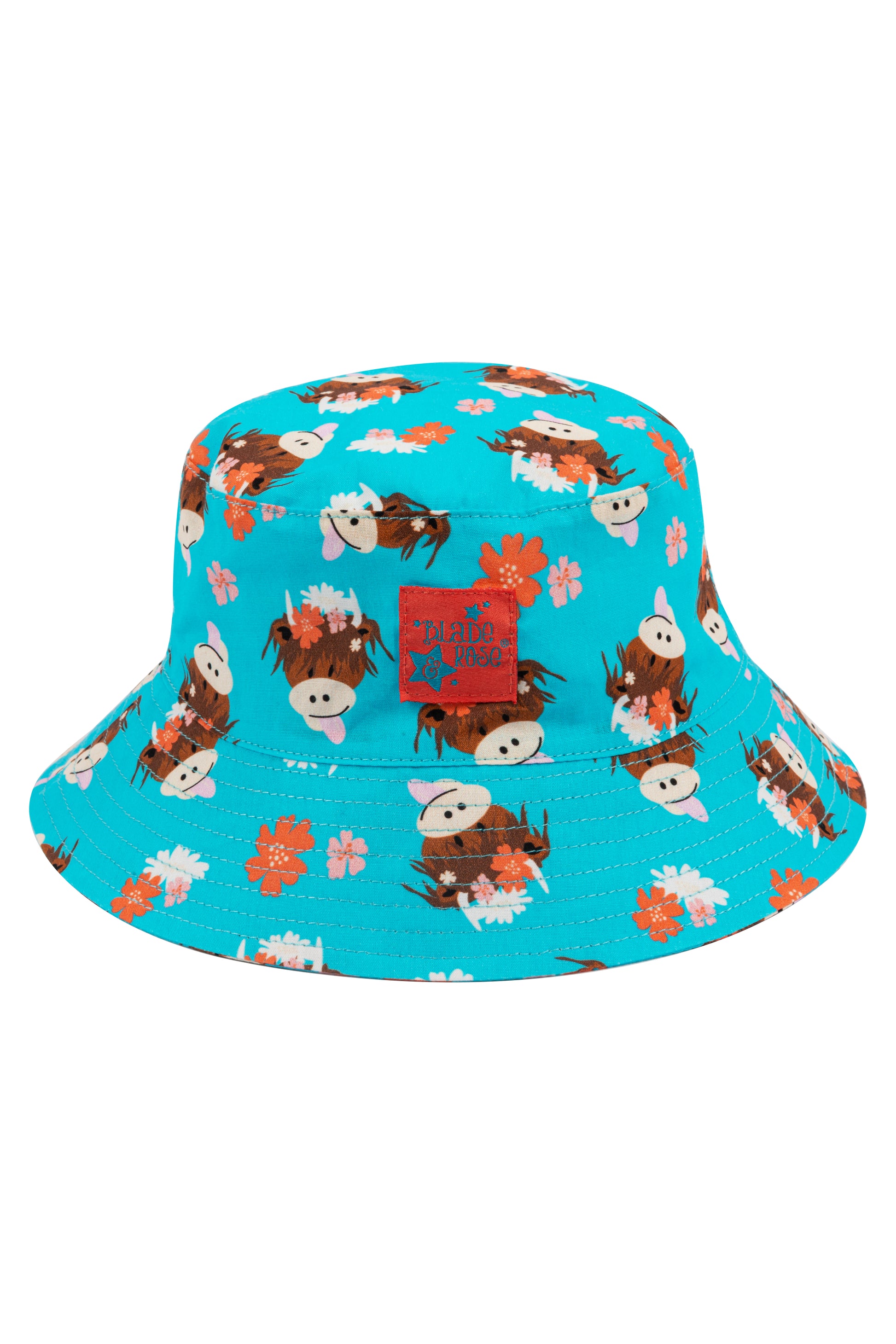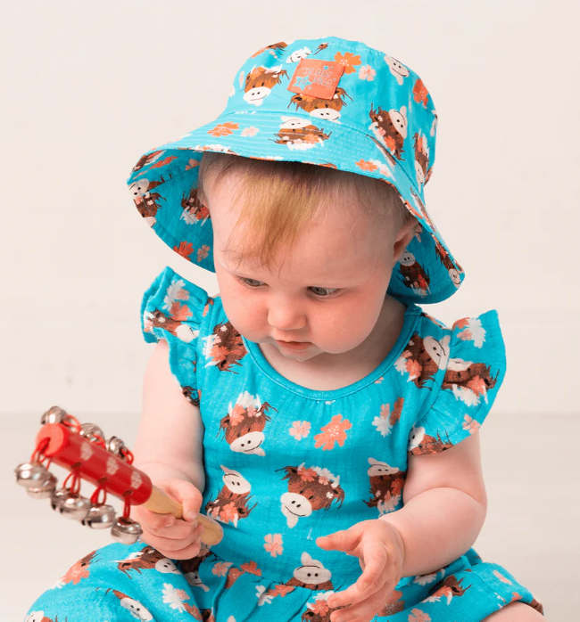 Fun babies summer hat featuring adorable Bonnie Highland Cow all over print. Perfect for sunny days out and will be a hit with any little ones.