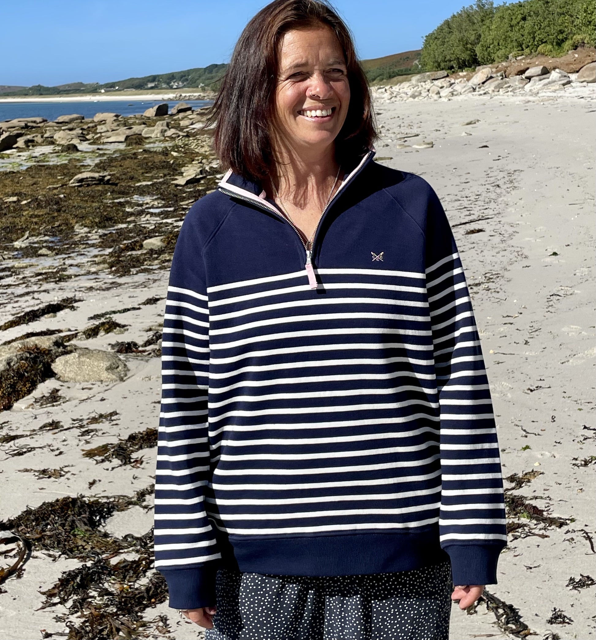 A classic nautical navy and white striped sweatshirt, with half zip. A wardrobe essential, the funnel neck of this sweat will keep you cosy and the ribbed cuffs and hem keeps things neat. Layer over shorts, jeans and skirts.