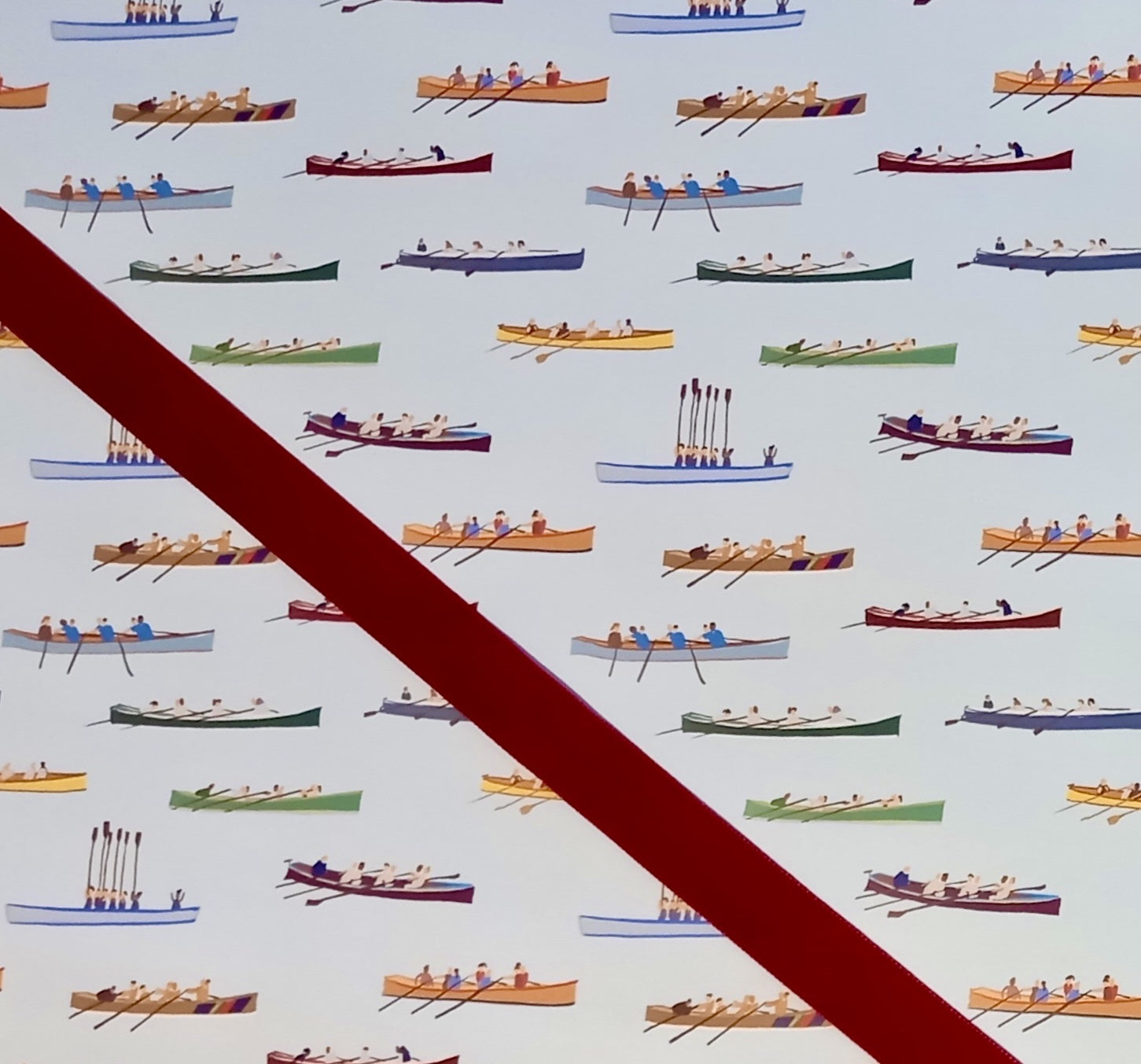 This gorgeous wrapping paper, featuring an array of colourful gig boats on a pale blue background, was designed by talented artist Holly Woodman.