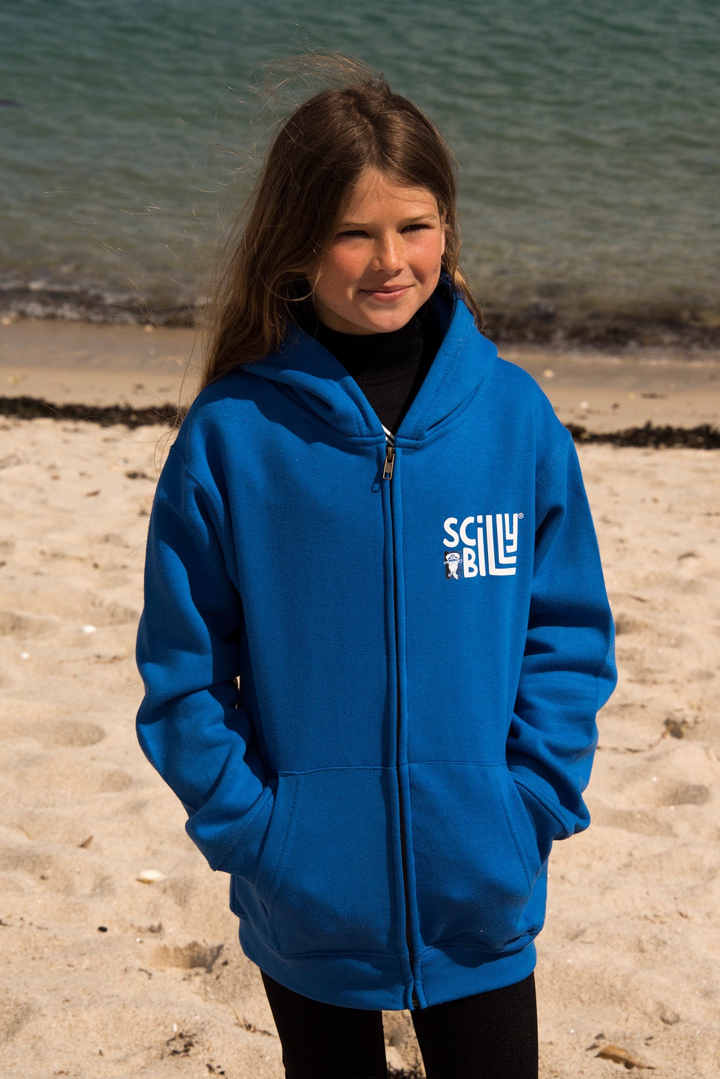 Kids can get their Scilly on and stay warm! High quality, heavyweight soft feel zipped hoodie featuring the Scilly Billy logo.