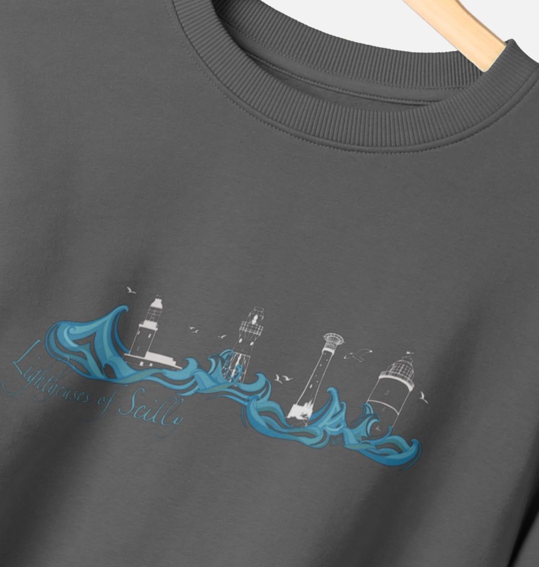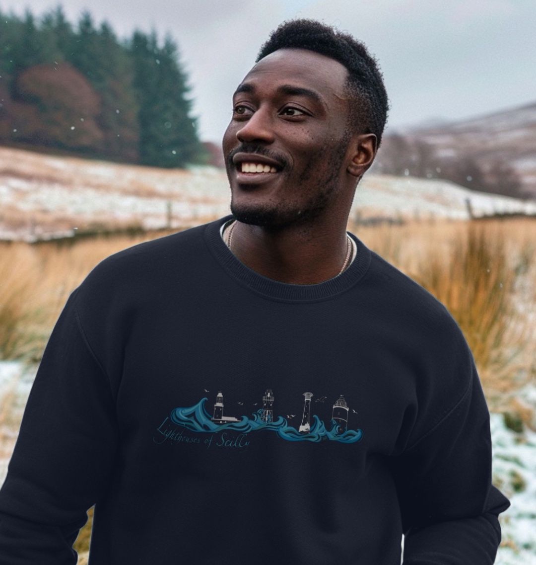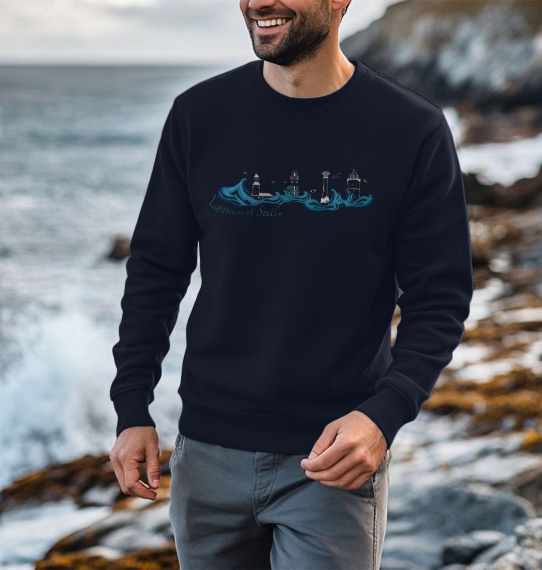 A gorgeous line up of the Lighthouses of Scilly, cradled by the swirling sea around them. This gorgeously soft men's sweat is also available without the "Lighthouses of Scilly" text.