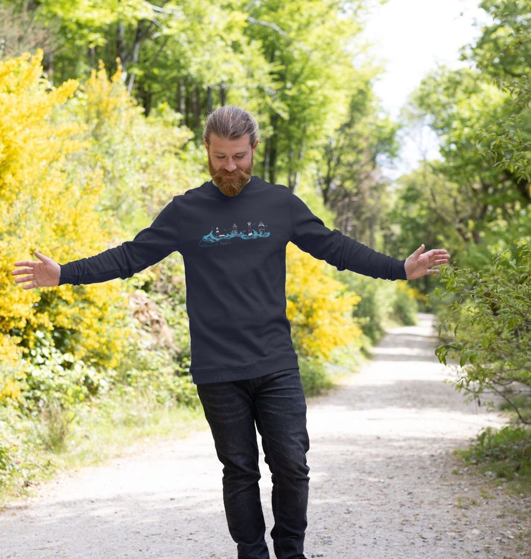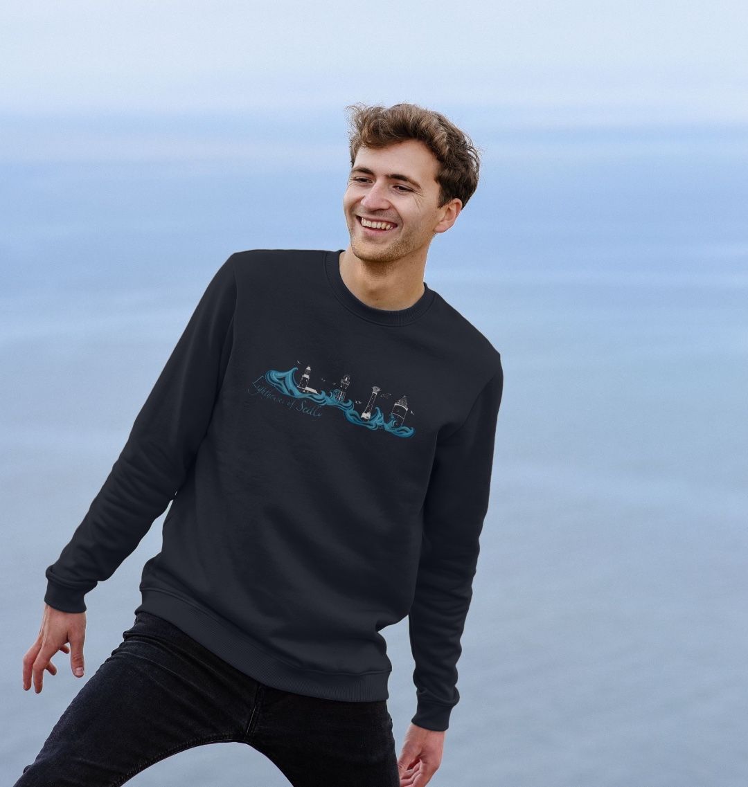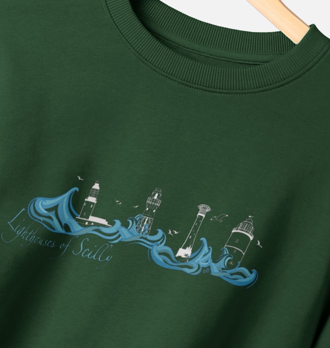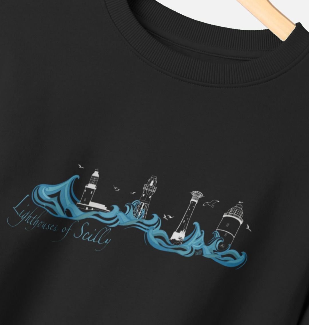 A gorgeous line up of the Lighthouses of Scilly, cradled by the swirling sea around them. This gorgeously soft men's sweat is also available without the "Lighthouses of Scilly" text.