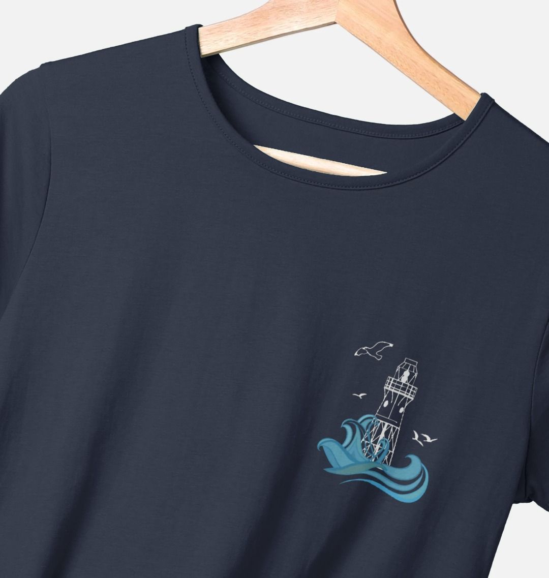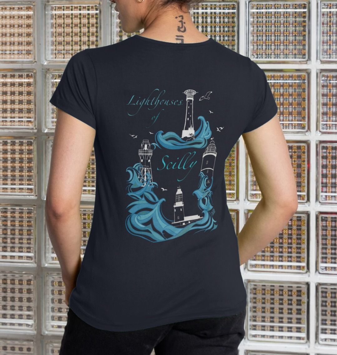 Featuring the Peninnis Head lighthouse as a breast print, and the full collection of the lighthouses of Scilly on the back, this women's tee is designed in Scilly, hand drawn on St Martin's. Made from organic cotton, in renewable energy powered mills, using low waste printing tech.