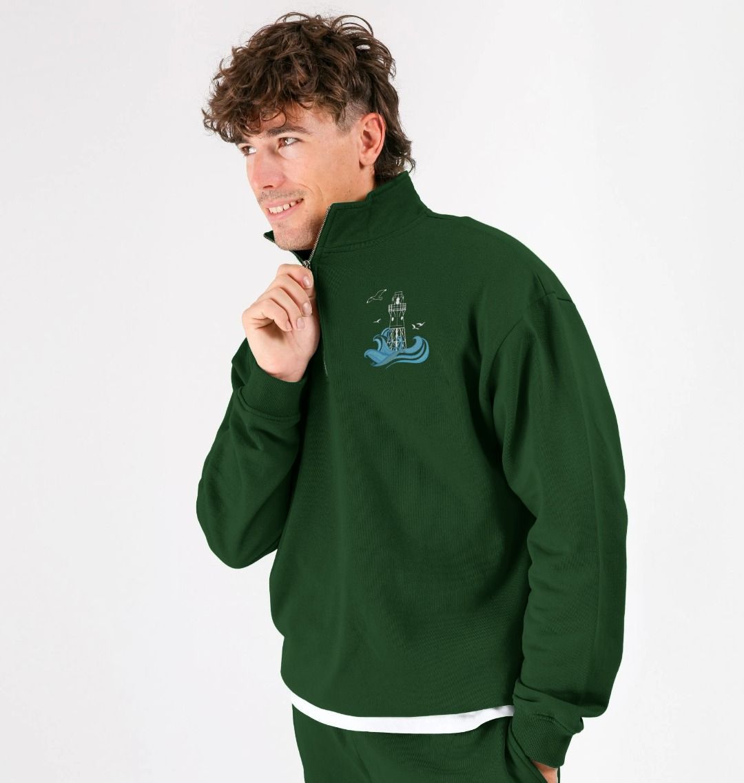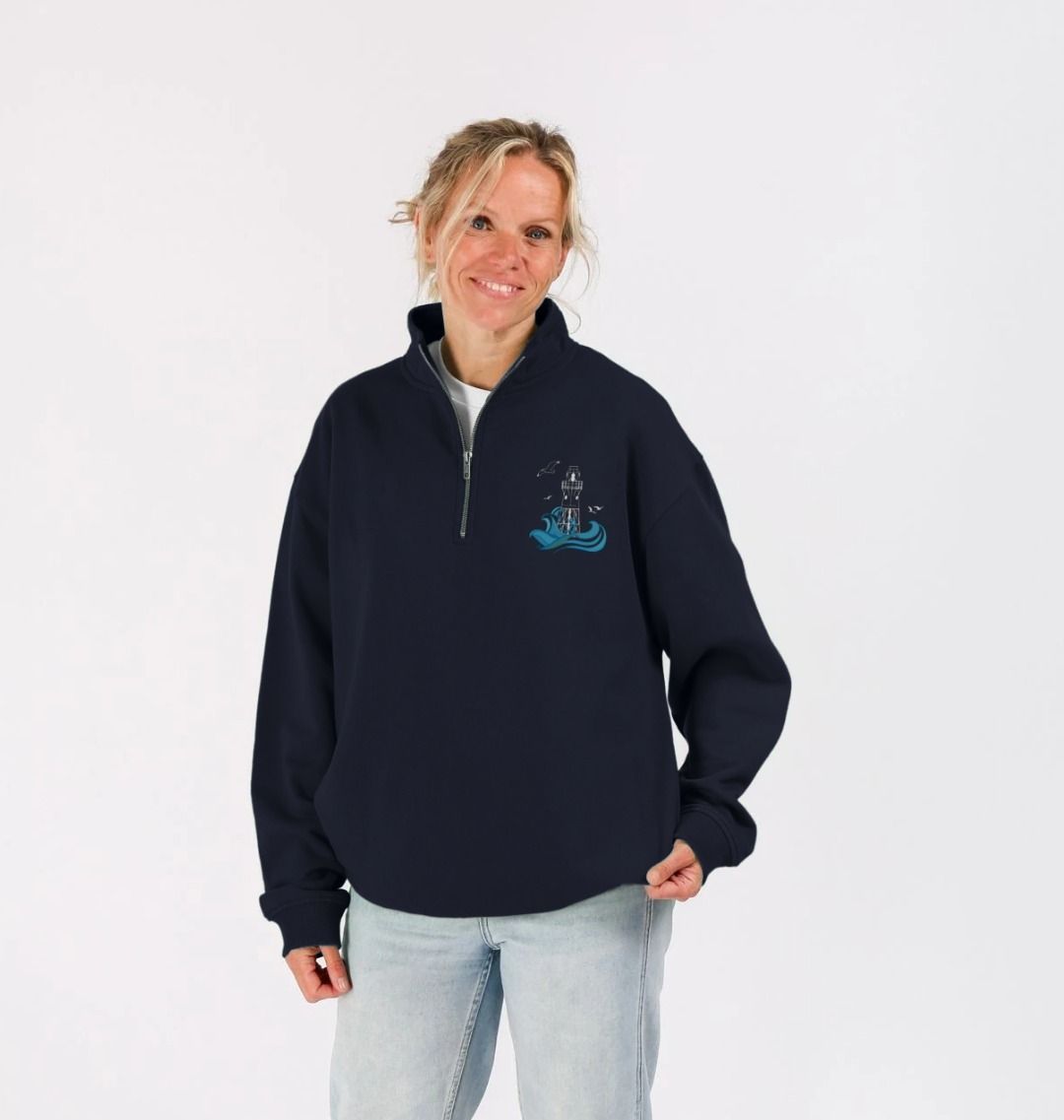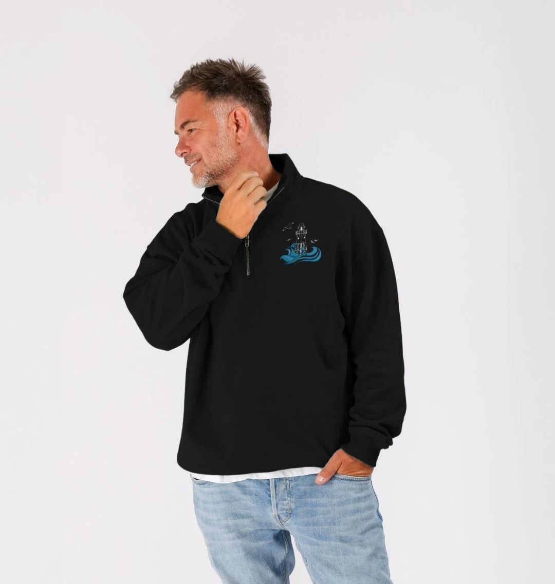 Featuring the Peninnis Lighthouse as a breast print, designed in Scilly, hand drawn on St Martin's. This quarter zip sweater is made from organic cotton, in renewable energy powered mills, using low waste printing tech.