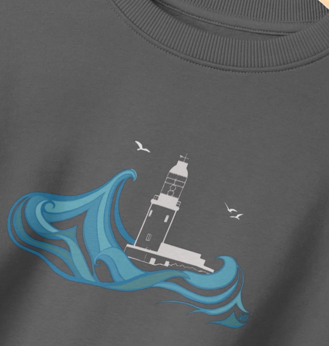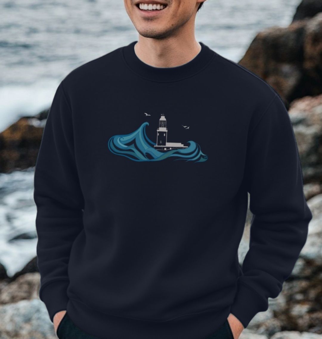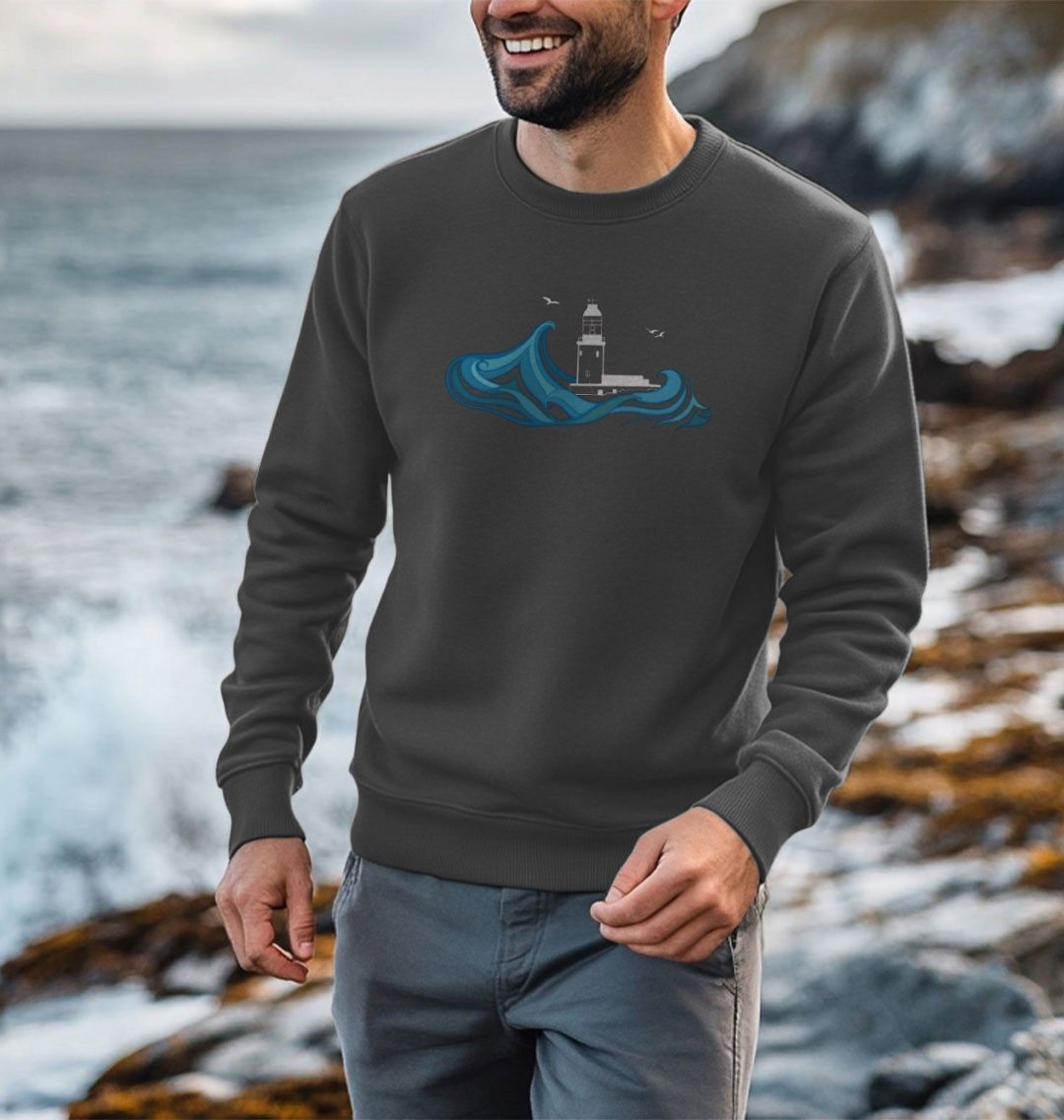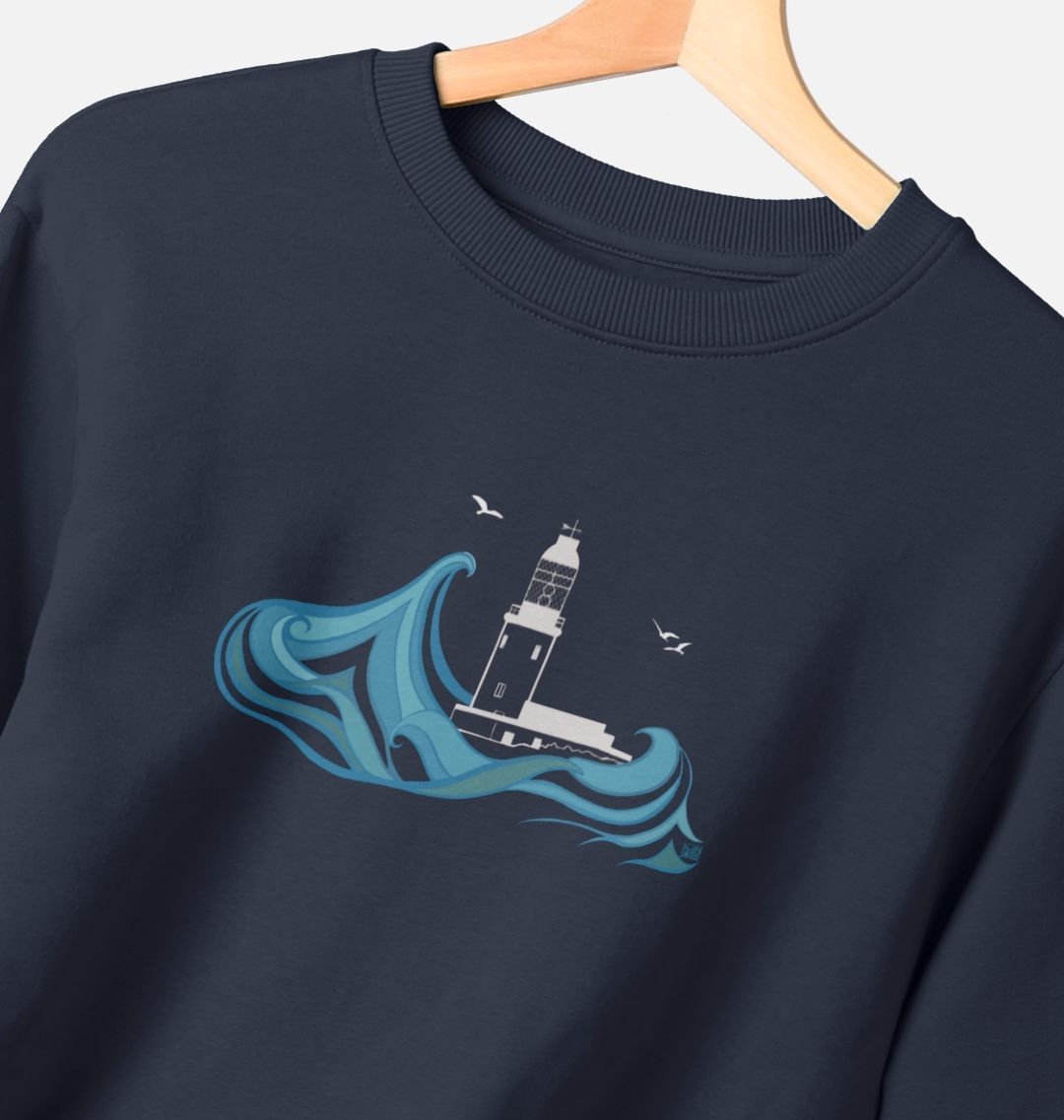 Featuring the Round Island lighthouse as a chest print, this men's sweater is designed in Scilly, hand drawn on St Martin's. Made from organic cotton, in renewable energy powered mills, using low waste printing tech.