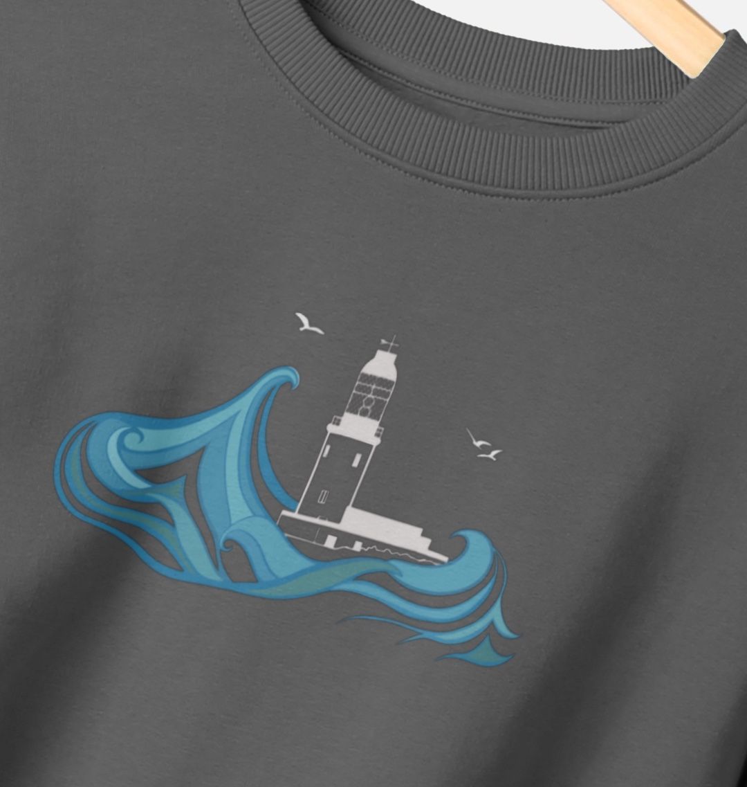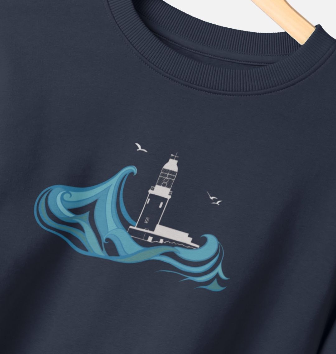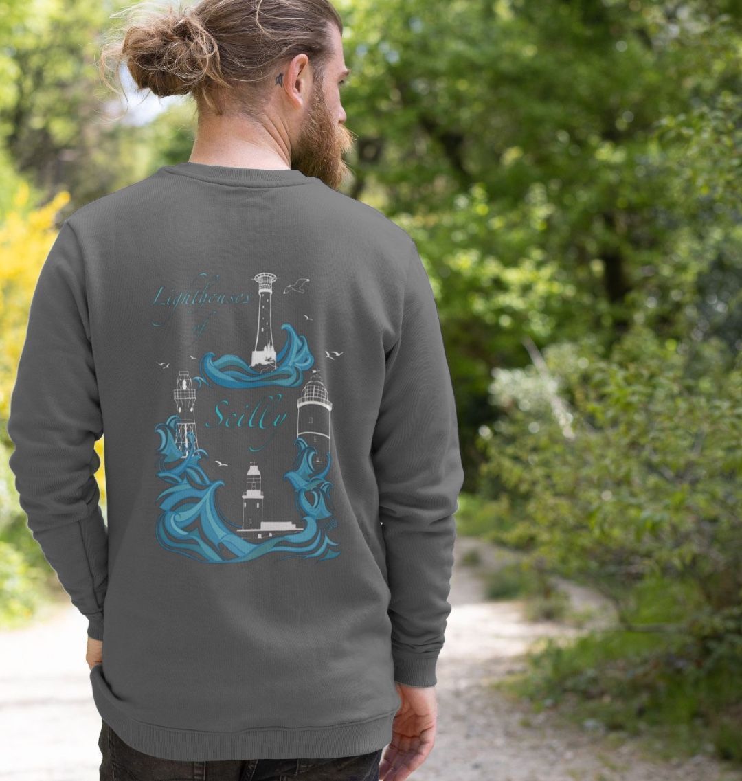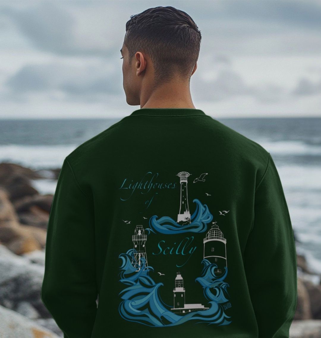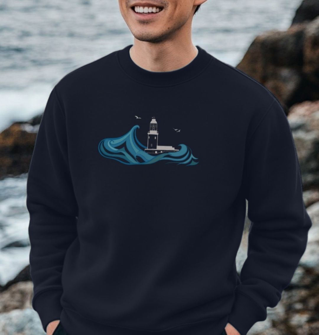 Featuring the Round Island lighthouse as a chest print, and the full collection of the Lighthouses of Scilly on the back, this men's sweater is designed in Scilly, hand drawn on St Martin's. Made from organic cotton, in renewable energy powered mills, using low waste printing tech.