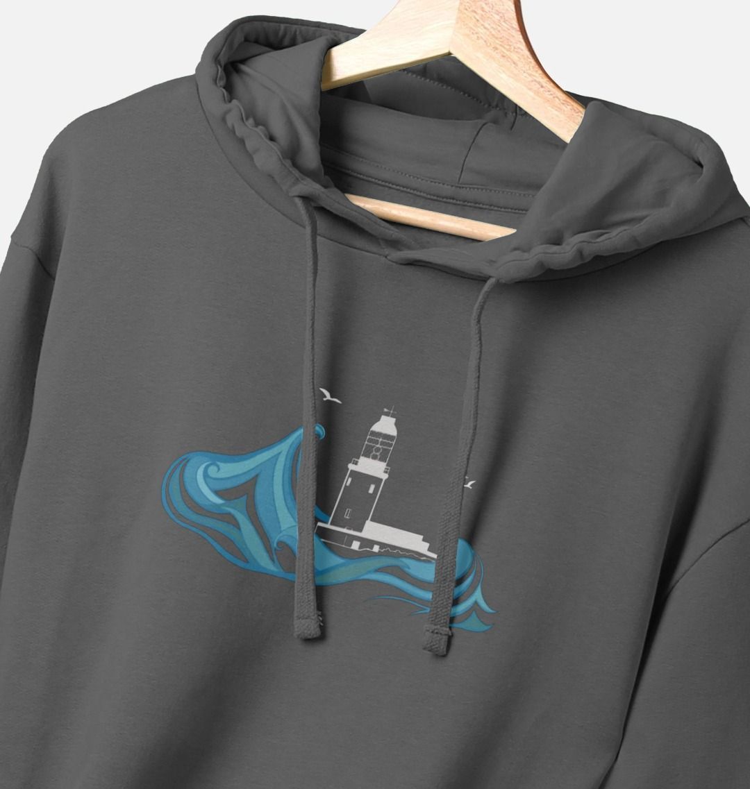 Featuring the Round Island lighthouse as a chest print, this men's hoodie is designed in Scilly, hand drawn on St Martin's. Made from organic cotton, in renewable energy powered mills, using low waste printing tech.