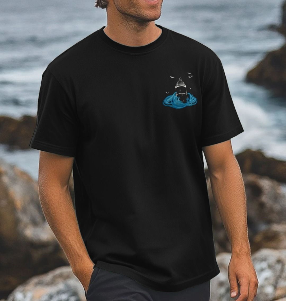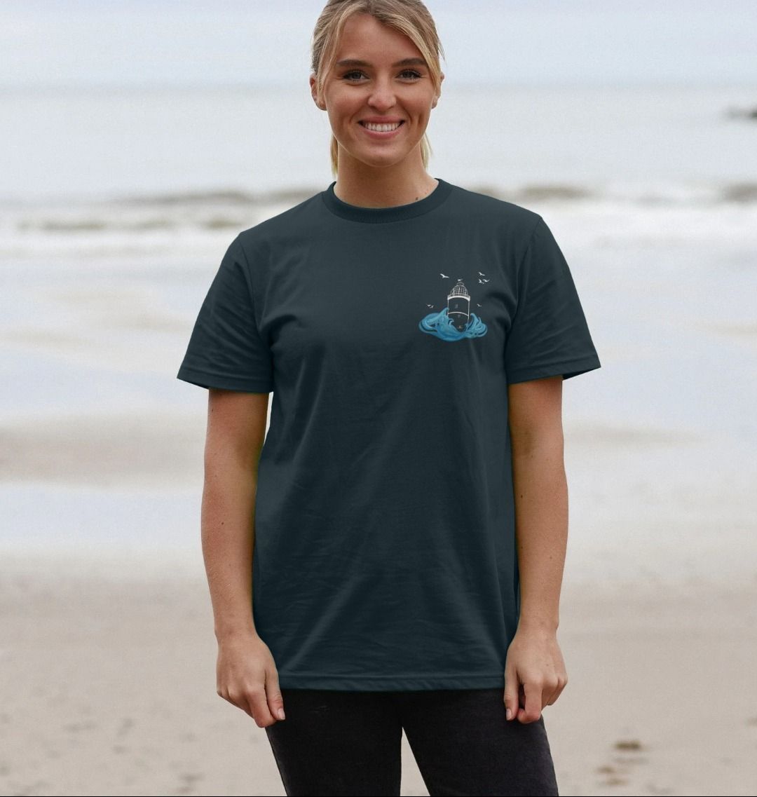 Featuring the St Agnes lighthouse as a breast print, and the full collection of the lighthouses of Scilly in the back design. This men's tee is designed in Scilly, hand drawn on St Martin's. Made from organic cotton, in renewable energy powered mills, using low waste printing tech.